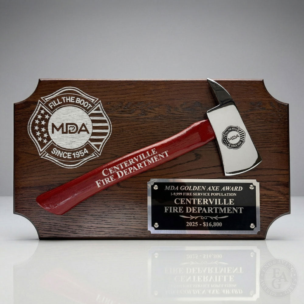 These retirement axe plaques are handmade to order and feature a full size firefighter axe in gold or chrome, each available in a variety of handle and plaque colors. The axe heads, handles, plates, and overall plaque can be engraved and fully customized to create a cherished keepsake that will honor your firefighters for a lifetime of dedicated service.
