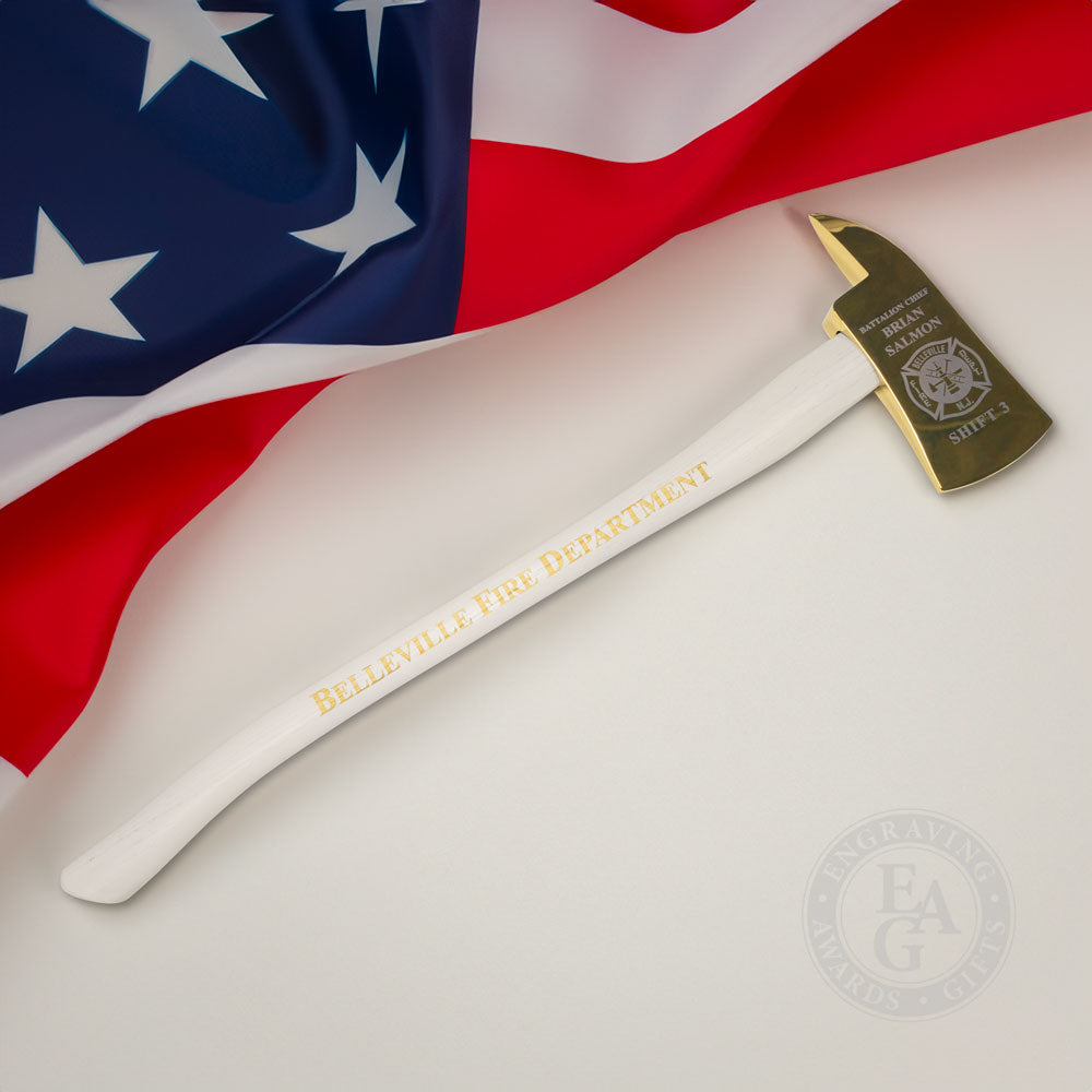 The Axe Head can be engraved with names, ranks, department patches, or other messaging. Engrave the American Hickory Axe Handle with the name of the department, years of service, or any other text. The axe handle text is laser engraved and hand painted in the color of your choice to create a quality finished keepsake your honoree will cherish for years to come.