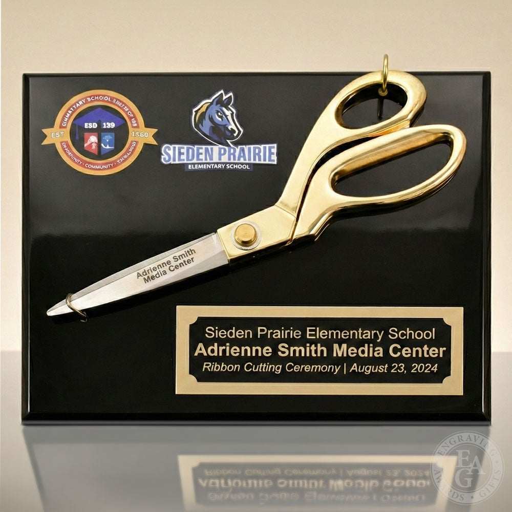 9-1/2" Gold Ceremonial Scissors Piano Finish Plaque. Looking for that extra WOW factor when displaying your ribbon cutting scissors? Get it with this piano finish plaque and 9-1/2" gold ceremonial ribbon cutting scissors! Available with optional laser engraving in the upper left corner with a plate, or forgo the plate altogether and engrave everything right on the board!