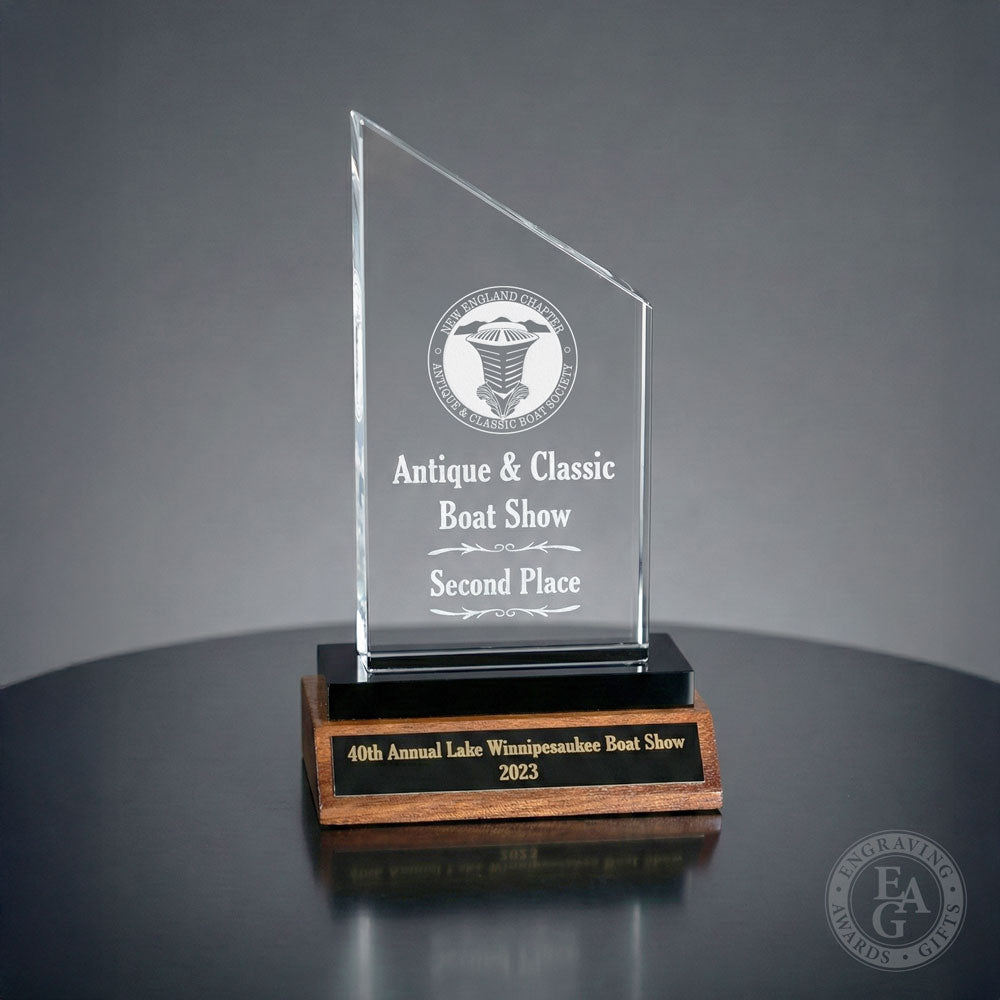 This award is made from 3/4" Thick Clear Acrylic cut into an iconic achievement award. The Peak includes a Black Acrylic/American Walnut base. In addition, an attached black brass plate is included on the base.