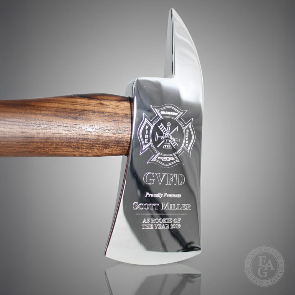 Small versions of our full size firefighter retirement axes, these 15in axes are perfect for years of service awards and promotions. The firefighter axe head is available in both gold and chrome and the handle comes in a variety of finishes to choose from. Each axe is custom made to order and can be engraved with department patches or logos, service dates, and names.