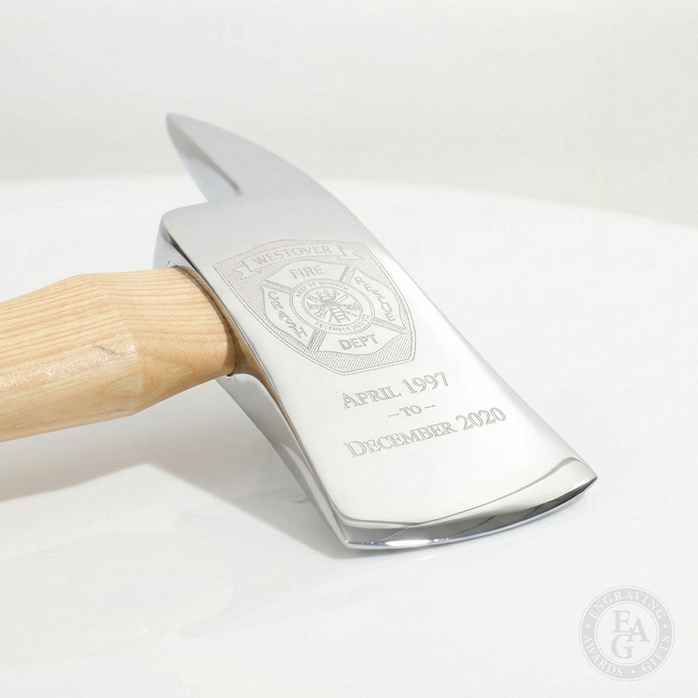 Small versions of our full size firefighter retirement axes, these 15in axes are perfect for years of service awards and promotions. The firefighter axe head is available in both gold and chrome and the handle comes in a variety of finishes to choose from. Each axe is custom made to order and can be engraved with department patches or logos, service dates, and names.