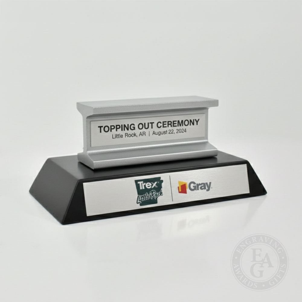 Silver Ceremonial I-Beams - Award - These resin I-beam awards attached to a black wood base are a great way to thank important guests at your Topping Out/Topping Off Ceremony or Construction Event. Add a logo, message, or picture to the top of the i-beam with full color printing. Add a full color brushed silver or a bright silver laser engraved plate. Includes white flip-top gift box.