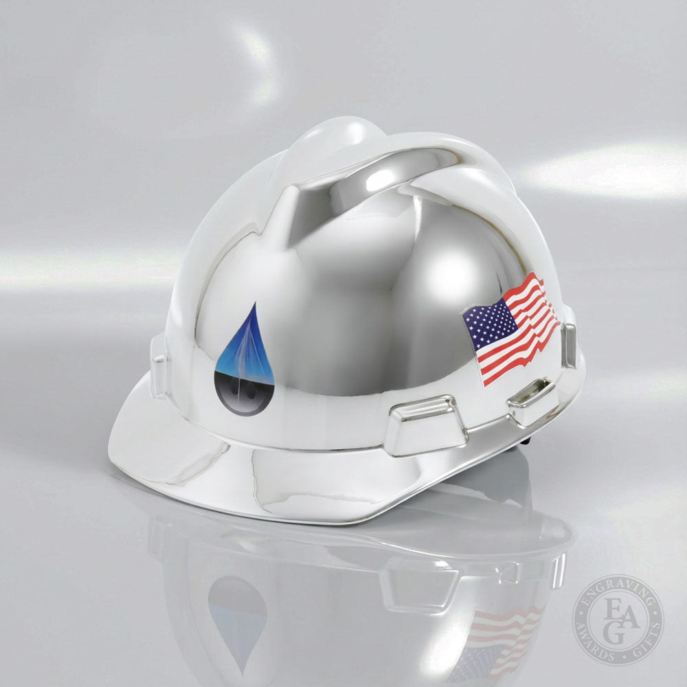 • This Chrome Plated Round Front Ceremonial Hard Hat features a beautiful mirror-finish plating that will impress all of the attendees at your Groundbreaking Ceremony, Topping-Out Ceremony, Demolition, or Re-construction Event. Its 4-Point Ratchet Suspension System is easy to adjust and allows the wearer to modify the fit while wearing the hard hat. These hard hats can be personalized with professionally applied vibrant UV-printed die-cut vinyl appliques.