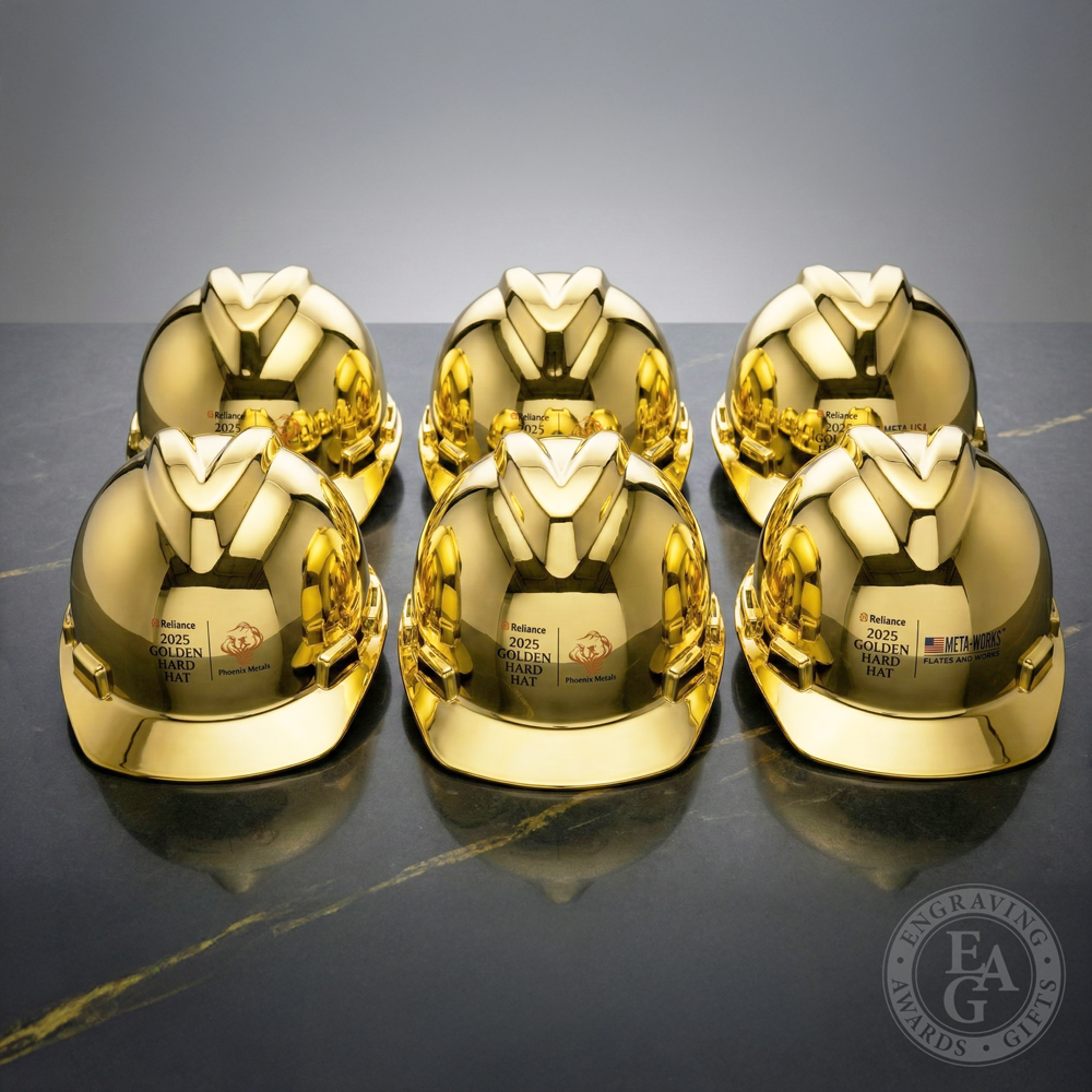 • This Gold Plated Round Front Ceremonial Hard Hat features a beautiful mirror-finish plating that will impress all of the attendees at your Groundbreaking Ceremony, Topping-Out Ceremony, Demolition, or Re-construction Event. Its 4-Point Ratchet Suspension System is easy to adjust and allows the wearer to modify the fit while wearing the hard hat. These hard hats can be personalized with professionally applied vibrant UV-printed die-cut vinyl appliques.