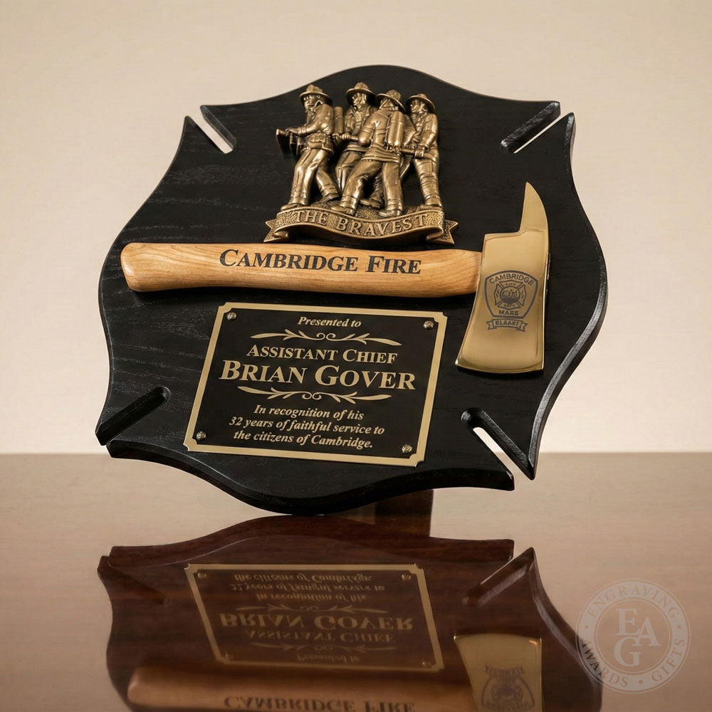 These firefighter award plaques are made from genuine walnut and include engraving on the black brass plate. There are plaque options available for every budget. This collection of firefighter plaques include wall clocks, malteses, and helmet shield plaques.