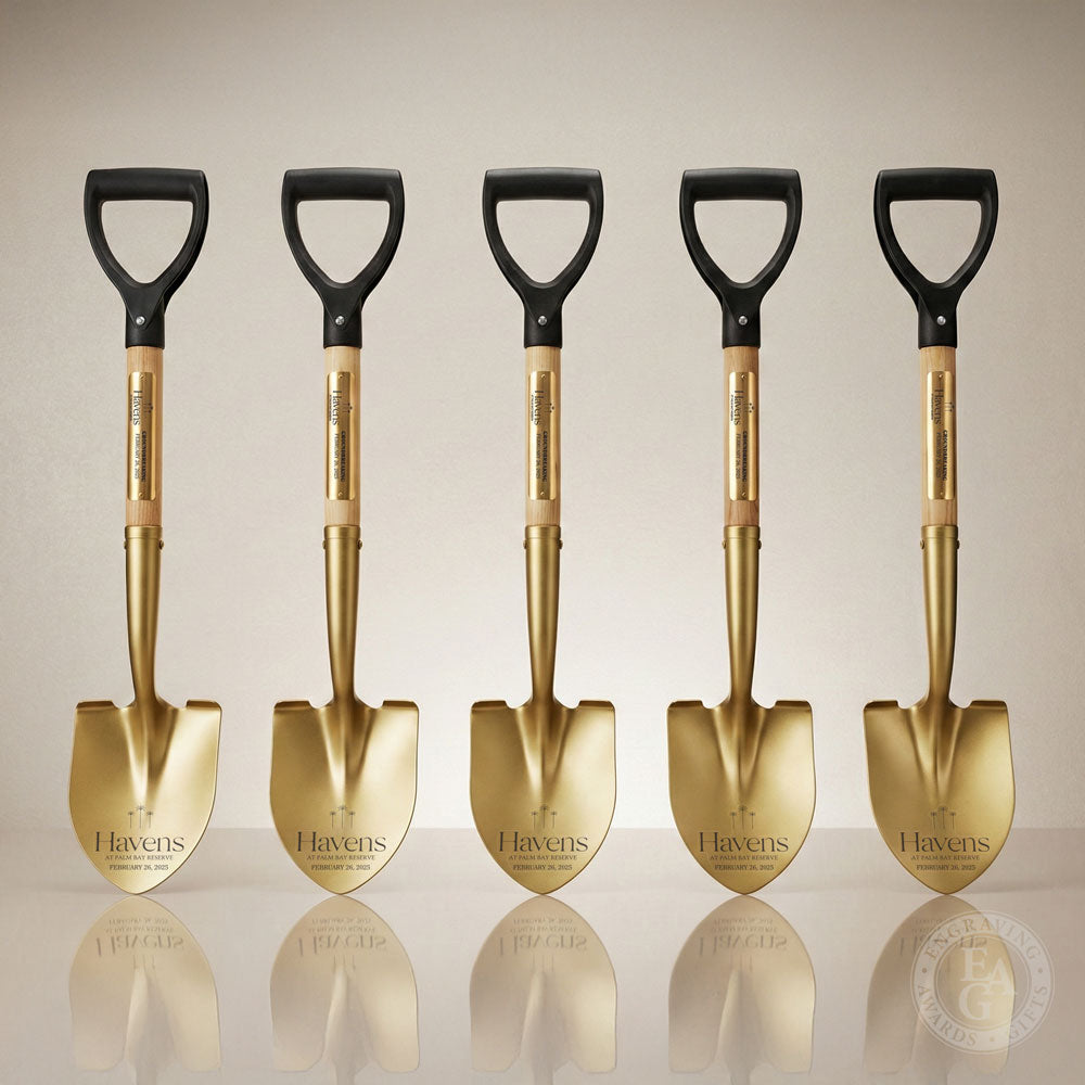 Our line of Groundbreaking Shovel Kits include our most popular gold, chrome, silver, and custom painted ceremonial shovels and hard hats - each featuring a wide range of custom personalization options to choose from. Each Groundbreaking Kit includes the option to add shovel display stands and bows.