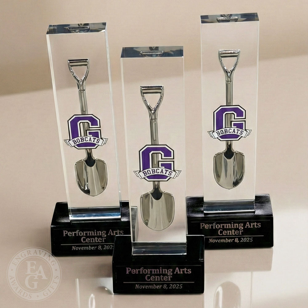 Ceremonial Shovel Embedment on Black Base. Our Acrylic Shovel Embedment on Black Base stands at 8” tall. This unique award features a bright gold or silver plated miniature shovel embedded in a clear acrylic block, mounted on a black resin base. There are a variety of personalization option available, to make your award extra special! This is a fantastic choice for very memorable giveaways at your Groundbreaking event.