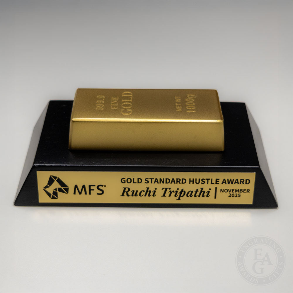 Ceremonial Gold Bar Award - These resin gold bar award is pre-engraved with "999.9 Fine Gold, NET WT 1000g" and attached to a black base to show your recipient how much you value them with all that pure gold represents! Get creative. Add a logo, message, or picture attached plate with full color printing. Add a full color brushed gold plate or bright gold laser engraved plate. Includes white flip-top gift box.