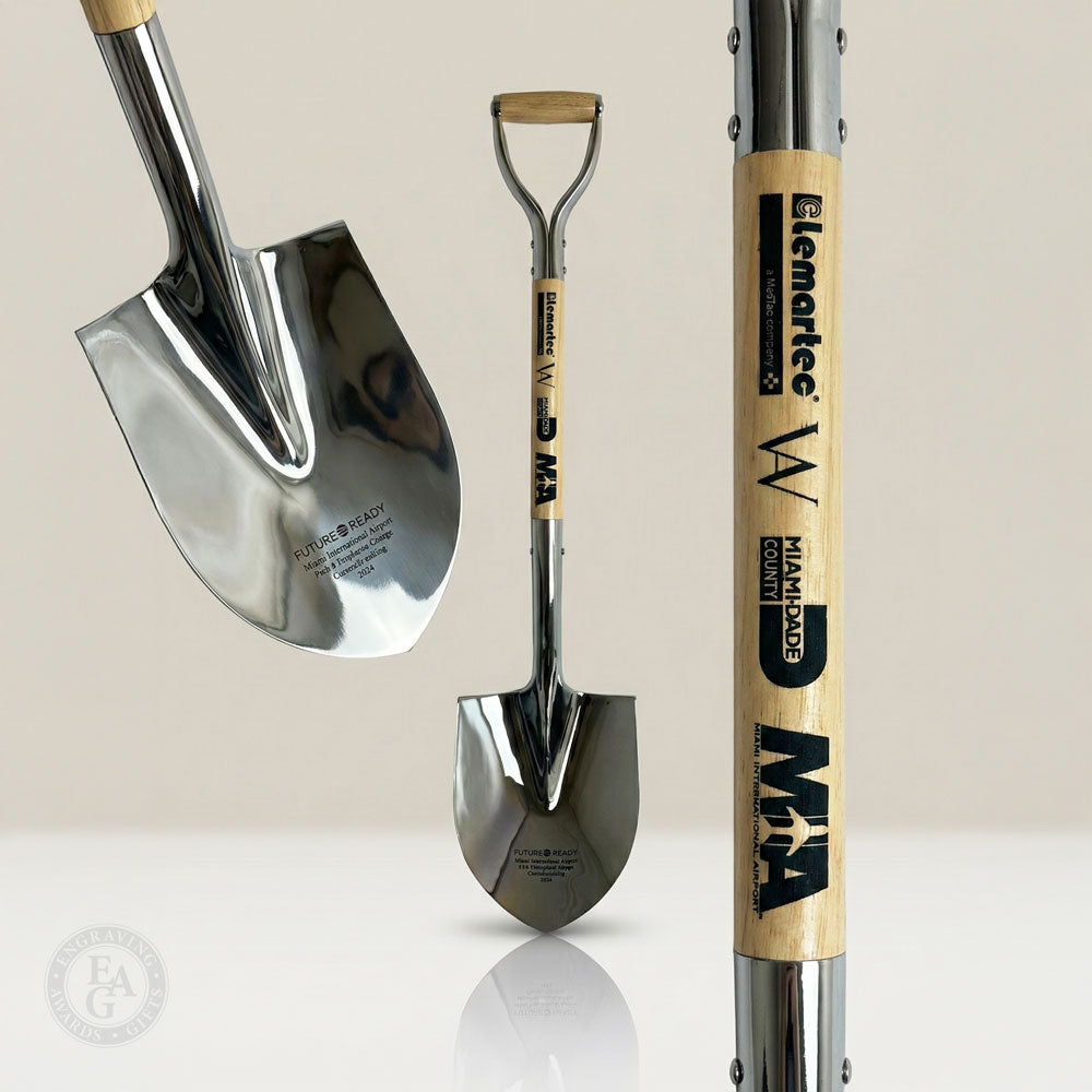 Our line of Groundbreaking Shovel Kits include our most popular gold, chrome, silver, and custom painted ceremonial shovels and hard hats - each featuring a wide range of custom personalization options to choose from. Each Groundbreaking Kit includes the option to add shovel display stands and bows.