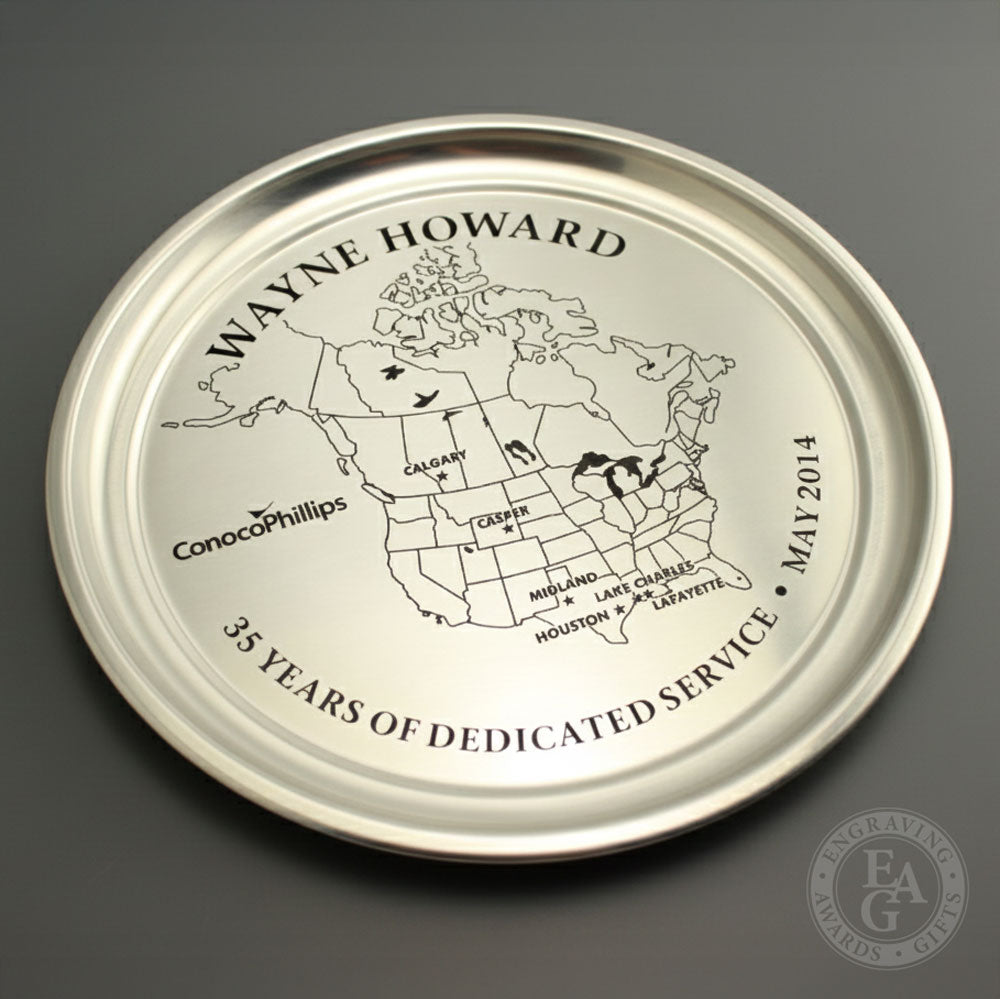 12" Diameter Gallery edge tray. Makes a great presentation award. We offer traditional rotary engraving or darkened laser engraving. Satin Finish.