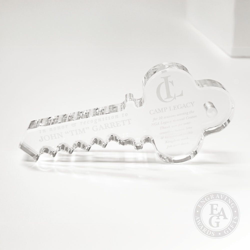 10" Ceremonial Key to the City - Acrylic - 10" x 4-3/4" x 1-1/4" acrylic key with a sleek beveled edge. This stunning award is a perfect way to recognize and honor someone special. Made from high-quality, acrylic, this key-shaped award makes a bold statement with its impressive size and eye-catching design. Choose to personalize the award with either full color printing or reverse laser engraving to make it even more special. This unique award is perfect for recognizing outstanding achievements or as a special token of appreciation. Whether you are recognizing a colleague, honoring a volunteer, or celebrating an achievement, this acrylic key award is sure to impress.