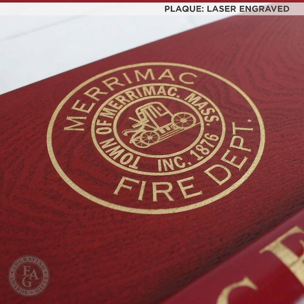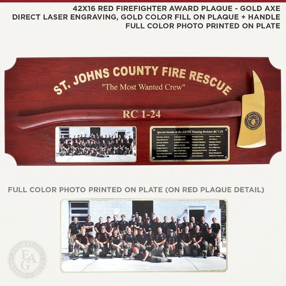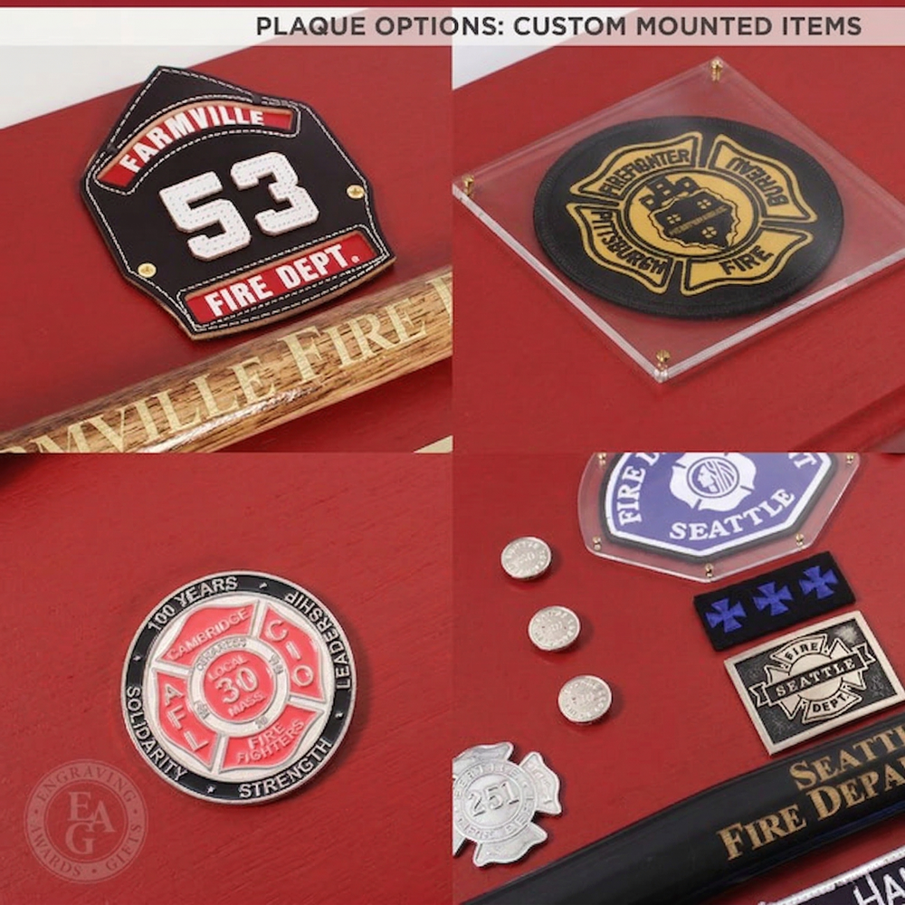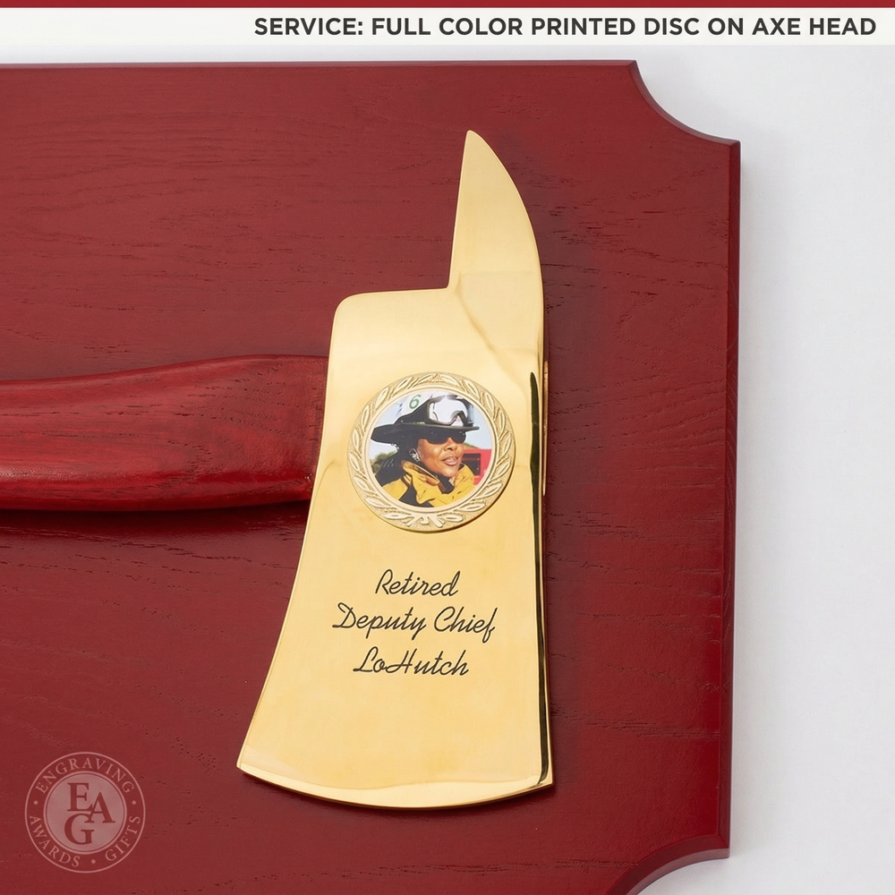 New color! We've added a modern red finish option for our classic 42x16 Firefighter Award Plaque. This service award plaque features a 36" gold plated firefighter axe in a handle color of your choice. Handle color options are Flamed (darkness varies), Natural, Red, or Black. The handle can be engraved with text and the axe head traditionally features the department's patch or logo. Engraving on the black brass plate is included and the plaque can be further customized with a wide selection of engraving services, castings, resins, service discs, patches, badges, or nearly anything else you would like to see.