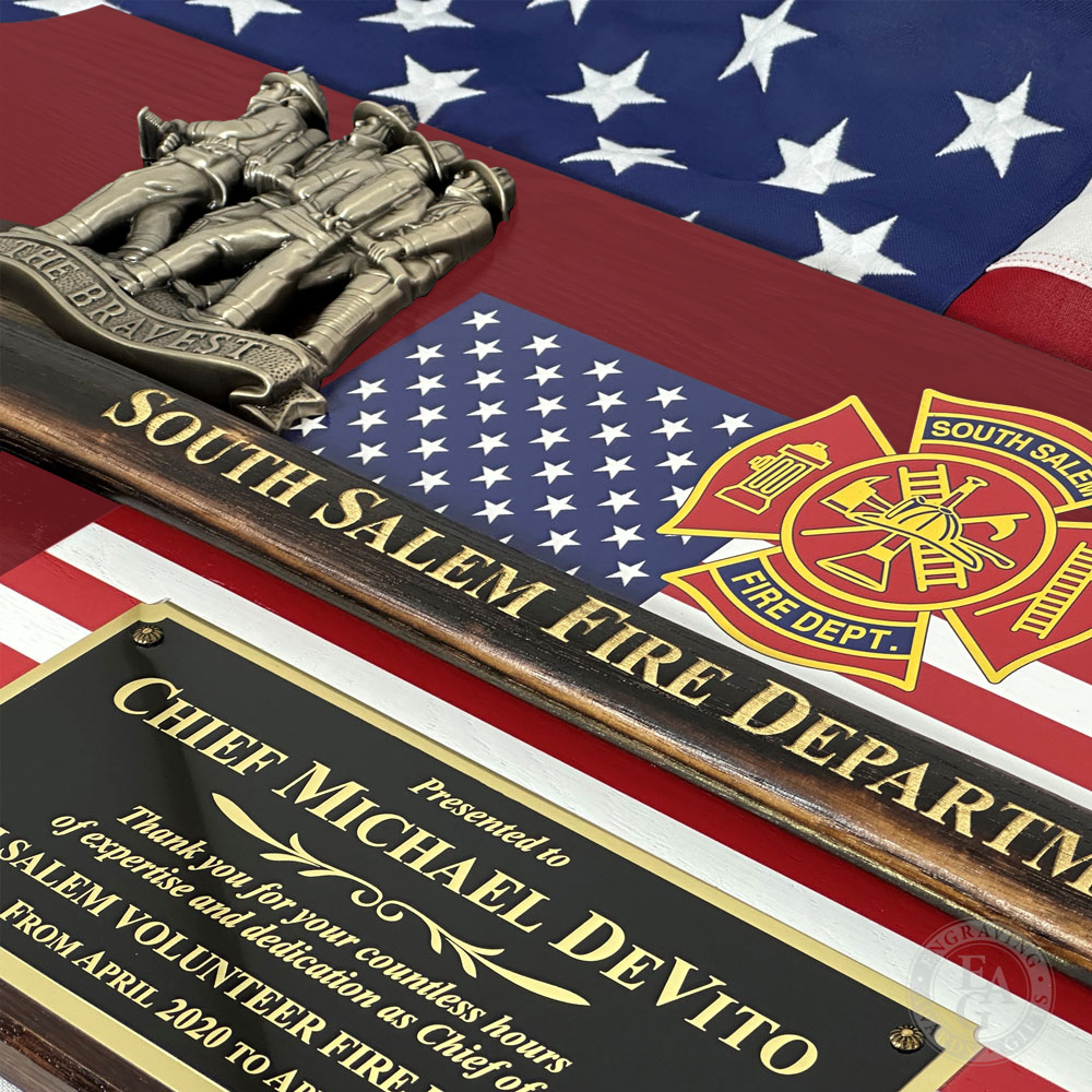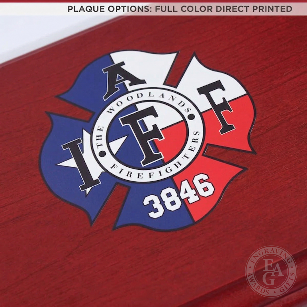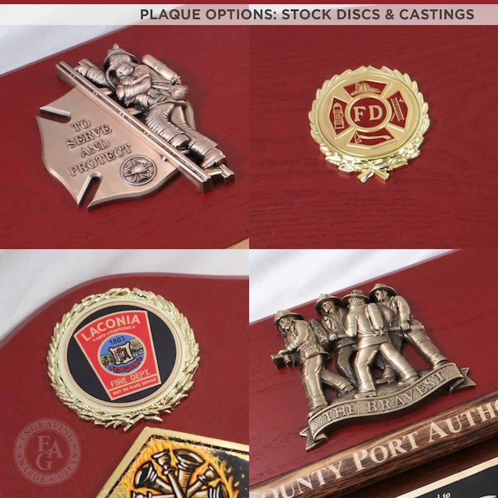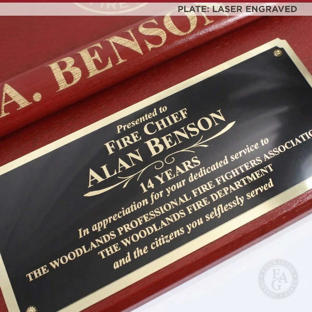 New color! We've added a modern red finish option for our classic 42x16 Firefighter Award Plaque. This service award plaque features a 36" gold plated firefighter axe in a handle color of your choice. Handle color options are Flamed (darkness varies), Natural, Red, or Black. The handle can be engraved with text and the axe head traditionally features the department's patch or logo. Engraving on the black brass plate is included and the plaque can be further customized with a wide selection of engraving services, castings, resins, service discs, patches, badges, or nearly anything else you would like to see.