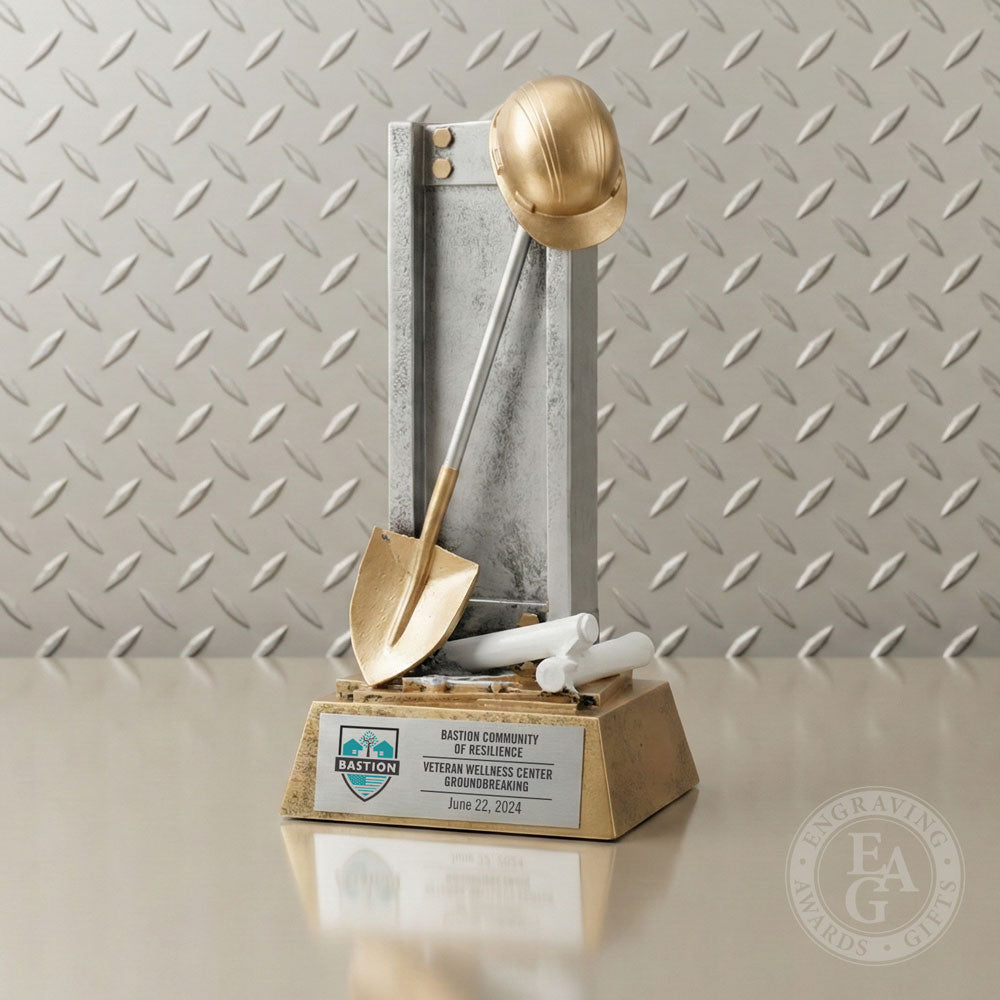 Ceremonial Construction Trophy Award This Construction Trophy Award features a hard hat, groundbreaking shovel, an i-beam, and blue prints. It's a perfect way to say thank you to key players of your groundbreaking ceremony, to honor important members of your construction team, or to celebrate people who made your topping out possible. It is 8-1/2", made of resin and has the option of a black brass plate that can be laser engraved or a brushed silver plate that can be full color printed.