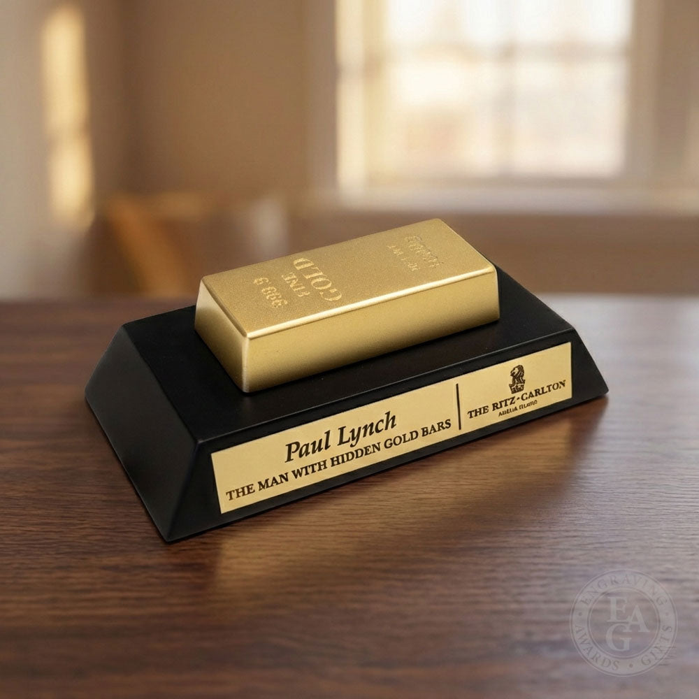 Ceremonial Gold Bar Award - These resin gold bar award is pre-engraved with "999.9 Fine Gold, NET WT 1000g" and attached to a black base to show your recipient how much you value them with all that pure gold represents! Get creative. Add a logo, message, or picture attached plate with full color printing. Add a full color brushed gold plate or bright gold laser engraved plate. Includes white flip-top gift box.