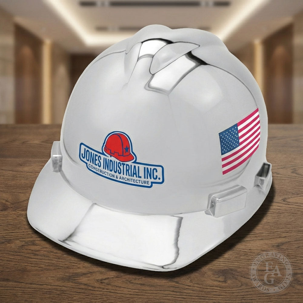 This Chrome Plated Round Front Ceremonial Hard Hat features a beautiful mirror-finish plating that will impress all of the attendees at your Groundbreaking Ceremony, Topping-Out Ceremony, Demolition, or Re-construction Event. Its 4-Point Ratchet Suspension System is easy to adjust and allows the wearer to modify the fit while wearing the hard hat. These hard hats can be personalized with professionally applied vibrant UV-printed die-cut vinyl appliques.